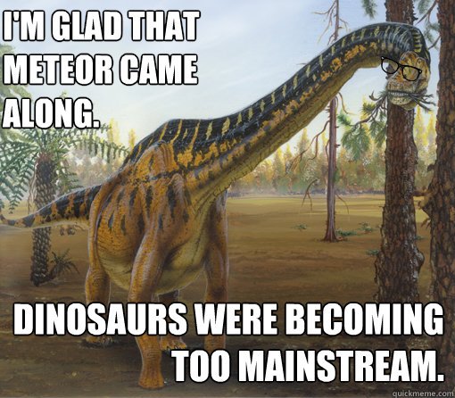 That meteor was our lucky star. I doubt we could have existed in all our glory alongside dinosaurs.