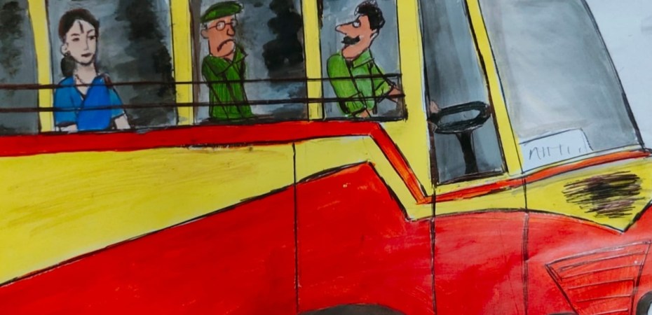 Sitting by a window seat, Ambujam’s panting slowly receded while she began to enjoy the light, cool breeze on her face. Sadagoppan, the conductor of the bus came up to deliver the ticket.